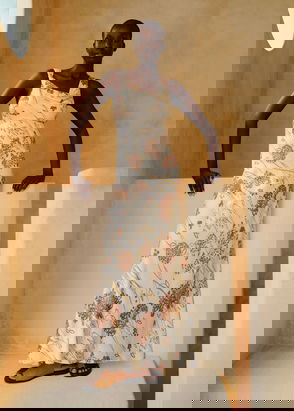Hydrangea Print Bias Cut Full-Length Dress Light Cream/Tan/Multi