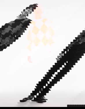 Joker Crew Neck Diamond Knitted Jumper In Black / Brown - BROWN