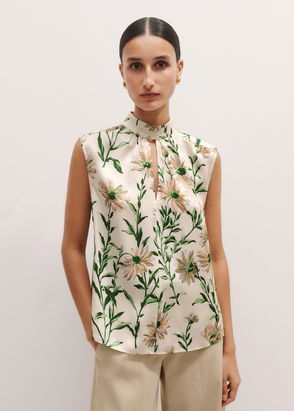 Silk Satin Growing Daisy Print Top + Tie Light Cream/Green/Multi