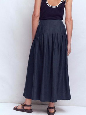 Pleated Pure Linen Midi Skirt, Navy