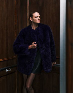 Featuring Kaia Gerber Faux Fur Collarless Jacket In Navy