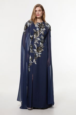 Floral 3D Embellished Drama Cape Sleeve Woven Maxi Dress