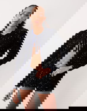 Sequin Tie Front Jacket Co-ord In Navy