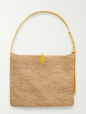Leather-trimmed Embroidered Raffia Shoulder Bag