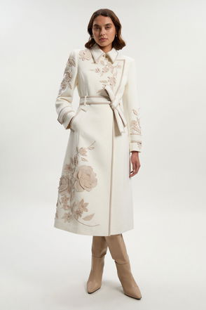 Brushed Wool Pu Mix Placed Floral Embroidery Applique Tailored Midi Coat