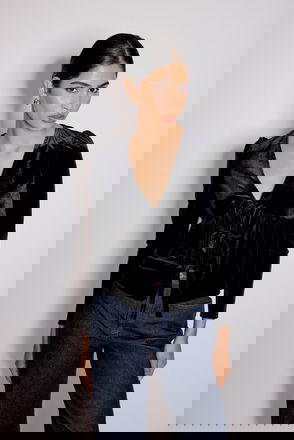 Starlight Puff Sleeve Floral Corduroy V-Neck Blouse, Black