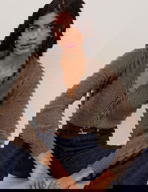 Brown Wool Blend Crochet Trim V-Neck Cardigan