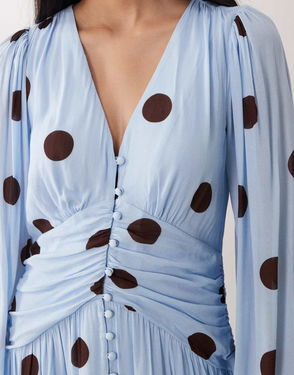 Luna V Neck Ruched Waist Button Front Midaxi Dress In Blue Oversized Polka Dot