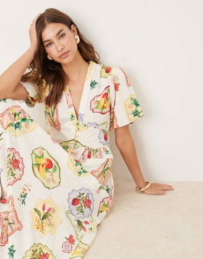 Starlight Puff Sleeve Midi Dress In Postcard Fruit Print