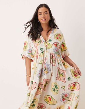 Plus Starlight Puff Sleeve Midi Dress In Postcard Fruit Print