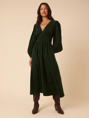 Riley Cord V-neck Midi Dress In Dark Green