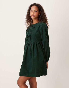 Eden Cord Triple Bow Smock Mini Dress In Dark Green