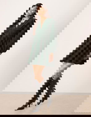Starlight Cord Balloon Sleeve Button Through V Neck Mini Dress In Forest Green