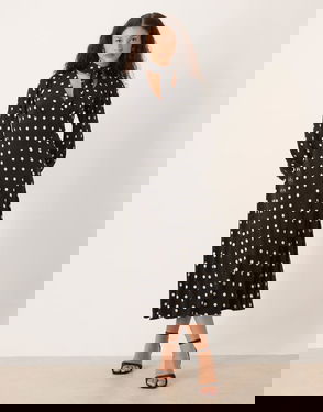 Kennedy V-Neck Polka Dot Midi Dress, Black/White