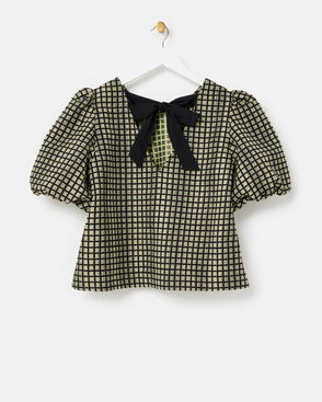 Checked Jacquard Puff Sleeve Top