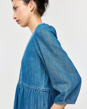 Blue Denim Embroidered V-Neck Midi Dress