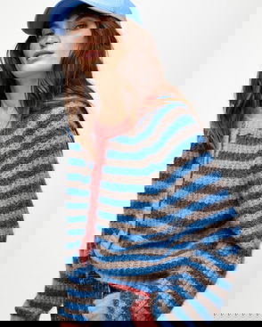 Brown & Blue Striped Ribbed Crew Neck Knitted Cardigan