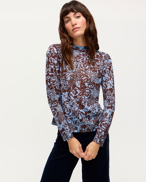 Brown & Blue Floral Mesh Long Sleeve Top