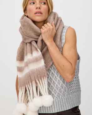 Mocha Brown & Cream Striped Pom Pom Heavyweight Scarf