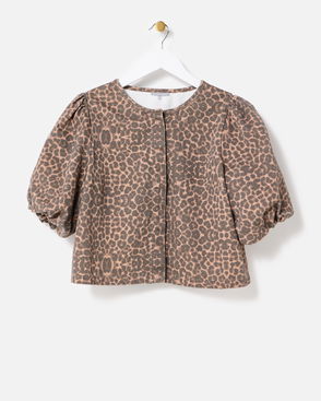 Brown Animal Print Denim Puff Sleeve Top