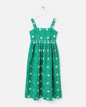 Green & White Daisy Embroidered Scalloped Cotton Midi Dress