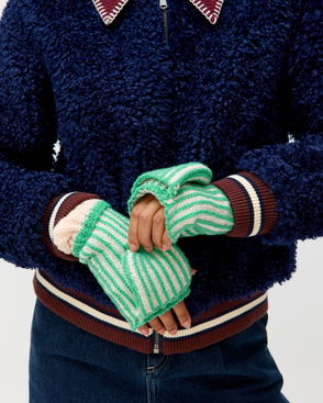 Green & White Striped Knitted Fingerless Mitten Gloves