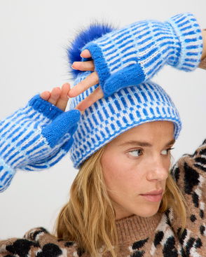 White & Blue Striped Knitted Fingerless Mitten Gloves