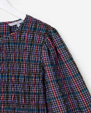 Black & Blue Checked Shirred Bodice Midi Smock Dress