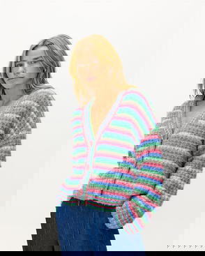 Multicoloured Striped V-Neck Fluffy Knitted Cardigan