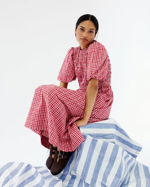 Red Gingham Shirred Bodice Puff Sleeve Midi Dress