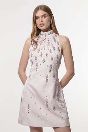 Texture Jacquard Crystal Embellished High Neck Woven Mini Dress