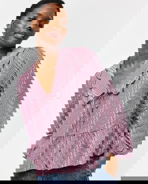 Burgundy Gingham Scalloped Collar Tie Front Blouse