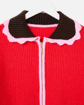 Red Scalloped Collar Zip Up Knitted Bomber Jacket