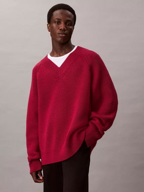 Cotton Chunky Knit Crew Neck Jumper In Dark Red