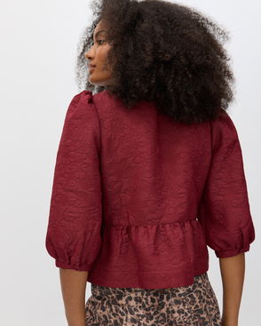 Burgundy Floral Jacquard Peplum Puff Sleeve Top