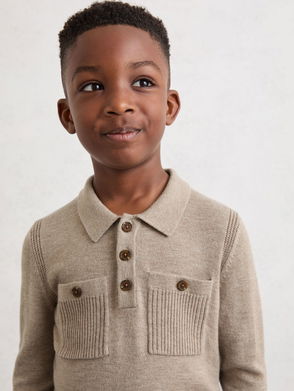 3-9 Yrs Half-Button Twin-Pocket Polo Jumper With Merino Wool In Oatmeal Melange