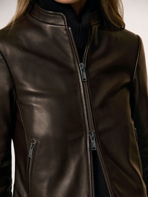 Petite Leather Collarless Biker Jacket In Chocolate Brown