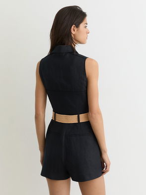 Linen Wave-Trim Cropped Cami Top In Navy/Brown