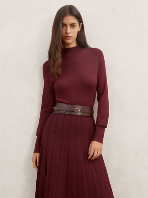 Mesh-Panel Belted Pleated Midi Dress In Burgundy