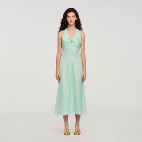 Cropped Embellished Cutout Slub Woven Halterneck Top