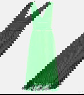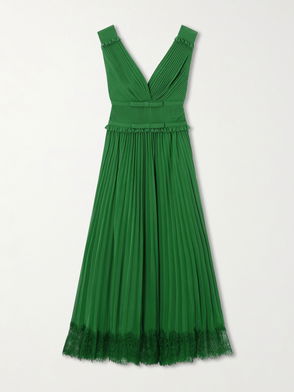 Lace-Trimmed Pleated Chiffon Midi Dress