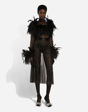 Calf-length Stretch Tulle Dress With Fusible Rhinestones And Rooster And Ostrich Feather Embellishme