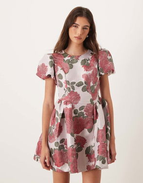 Dream Jacquard Puff Sleeve Mini Dress Co-ord In Pink Floral