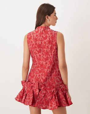 Shimmy Exclusive Jacquard Sleeveless Cinched Waist Bow Hem Mini Dress In Red