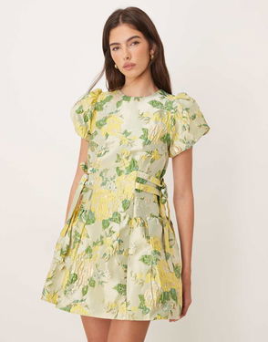 Dream Sunspel Jacquard Puff Sleeve Tie Bow Side Mini Dress In Lime Floral
