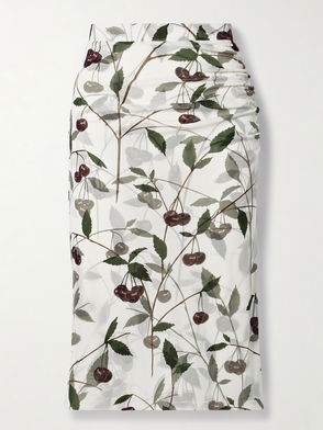 Strapless Ruched Printed Stretch-Mesh Maxi Dress
