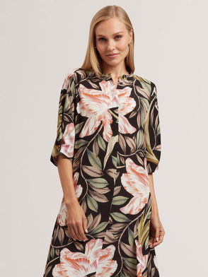 Abstract Floral Puff Sleeve Midi Dress