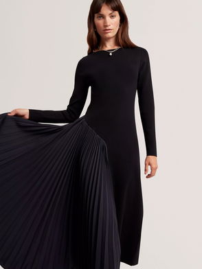 Belviee Long Sleeve A-Line Pleated Midi Dress