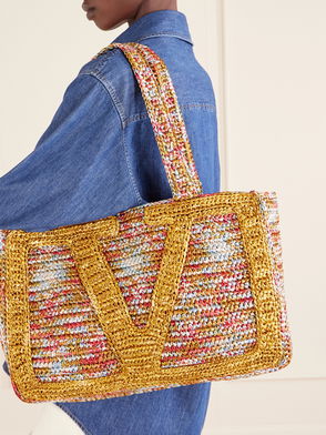VLogo Signature Medium Embellished Leather-trimmed Striped Crocheted Raffia Tote