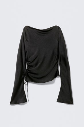Ruched Boat-Neck Trumpet Sleeve Top